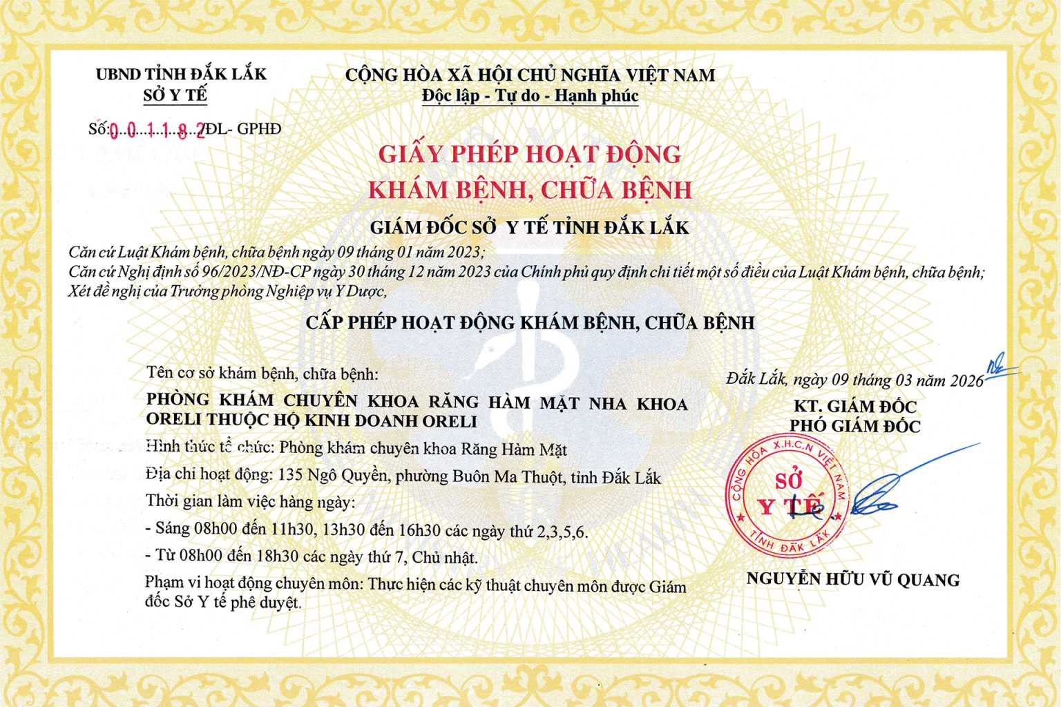 Nha khoa Oreli được cấp phép hoạt động bởi Sở Y Tế tỉnh Đăk Lăk, đảm bảo đáp ứng các tiêu chuẩn cần thiết của một cơ sở khám chữa bệnh. Đây là nền tảng quan trọng giúp khách hàng yên tâm khi lựa chọn dịch vụ.