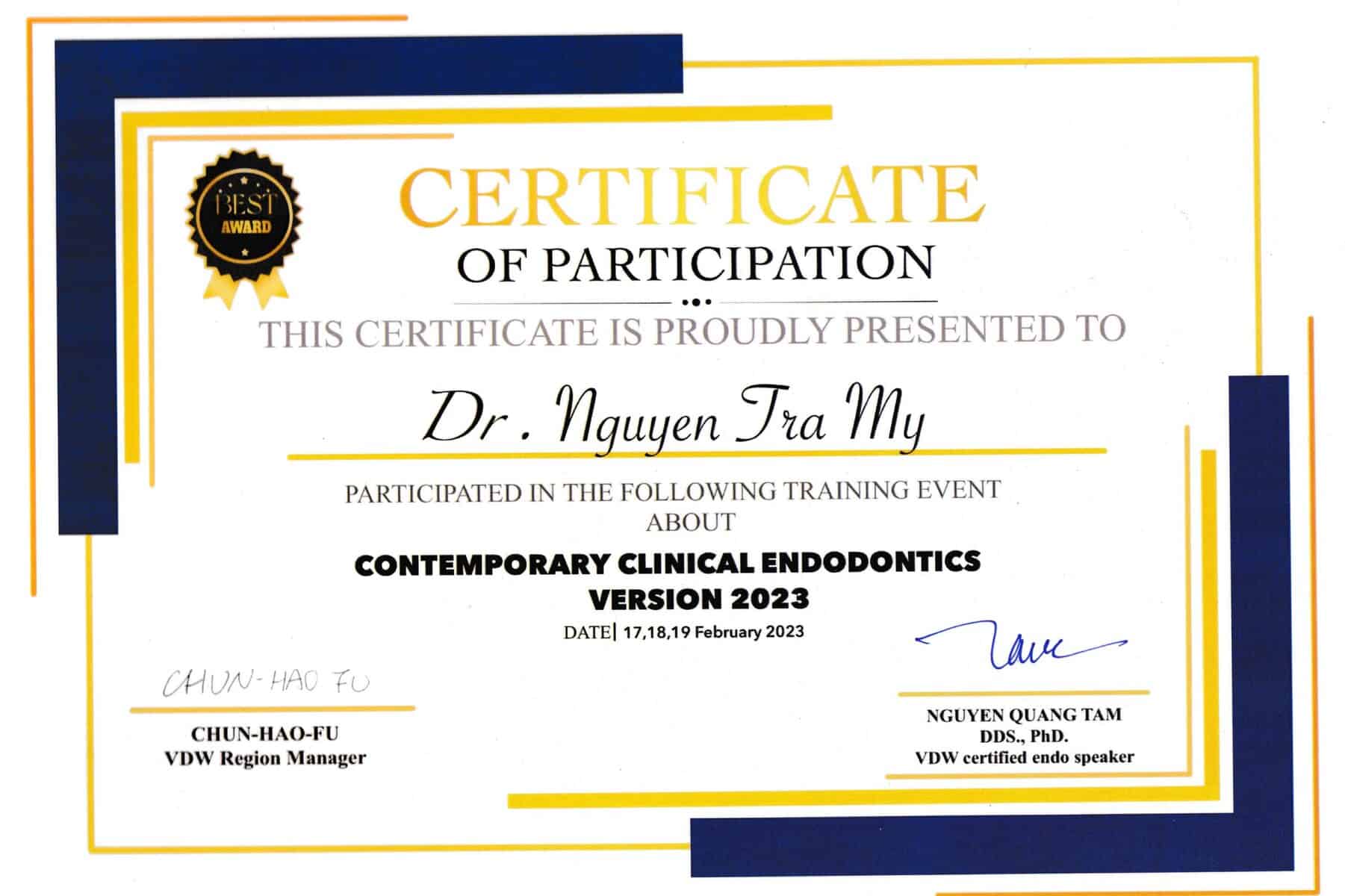 Bác sĩ Nguyễn Trà My tham gia các chương trình đào tạo chuyên sâu về chỉnh nha nhằm cập nhật phương pháp điều trị hiện đại và nâng cao hiệu quả lâm sàng.